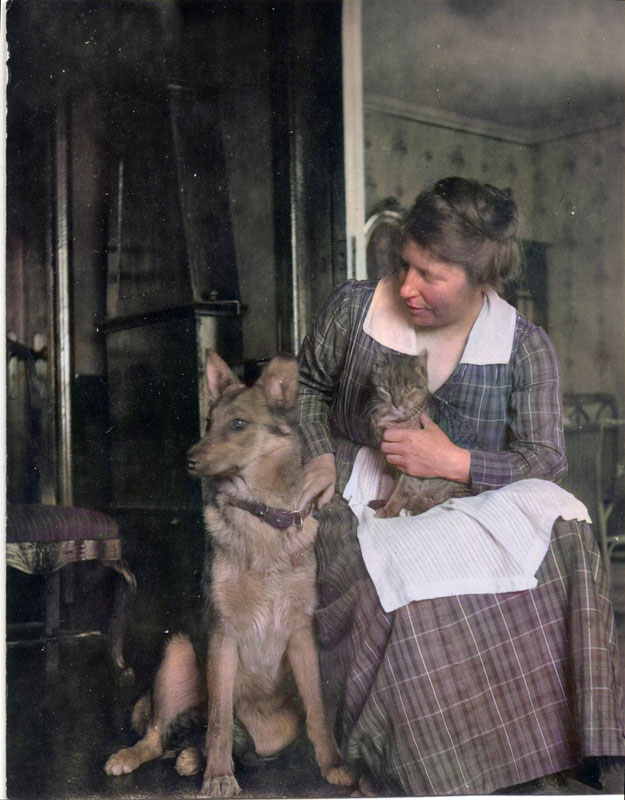 Elin sitter i dörröppningen mellan matsalen och salongen i Villa Solfrid tillsammans med sin hund och katt, i början på 1920-talet. Minnet av den första hunden lever fortfarande kvar i Villa Solfrid.