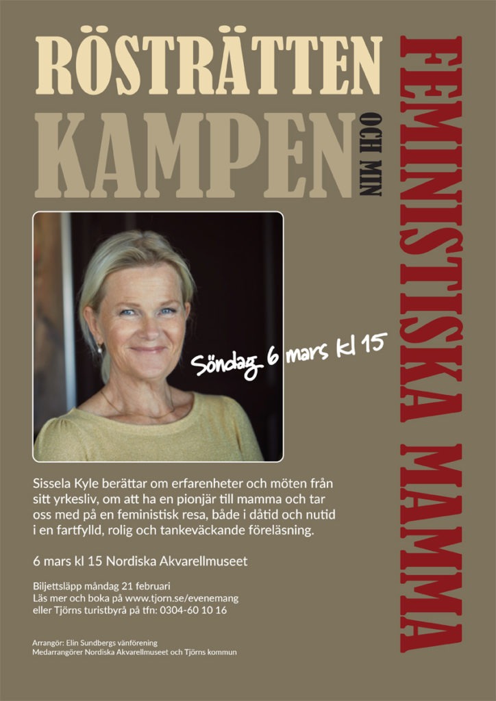 Söndag den 6 mars smygstartar vi firandet av internationella kvinnodagen på Nordiska Akvarellmuseet ihop med Sissela Kyle och en miniutställning för att lyfta några av Tjörns egna rösträttskämpar. Sissela berättar om erfarenheter och möten från sitt yrkesliv, om att ha en pionjär till mamma och tar oss med på en feministisk resa, både i dåtid och nutid i en fartfylld, rolig och tankeväckande föreläsning.