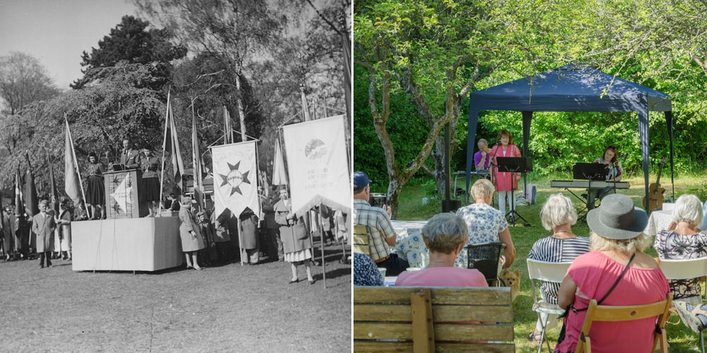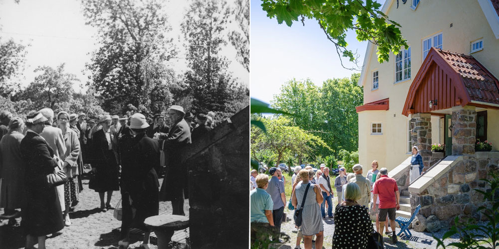 I Elin Sundbergs privata fotoalbum finns dessa godbitar till fotografier tagna i Villa Solfrids trädgård någon gång på 50-talet. Fröken Sundberg hade bjudit in vänner och bekanta från I.O.G.T och Vita Bandet som kom med abonnerade bussar från Göteborg en solig försommardag. Fröken Sundberg stod på den stora granittrappan till Villa Solfrid och välkomnade sina gäster precis som vi gör än idag när vi tar emot er besökare på våra guidade turer! Villa Solfrid – Då & Nu!